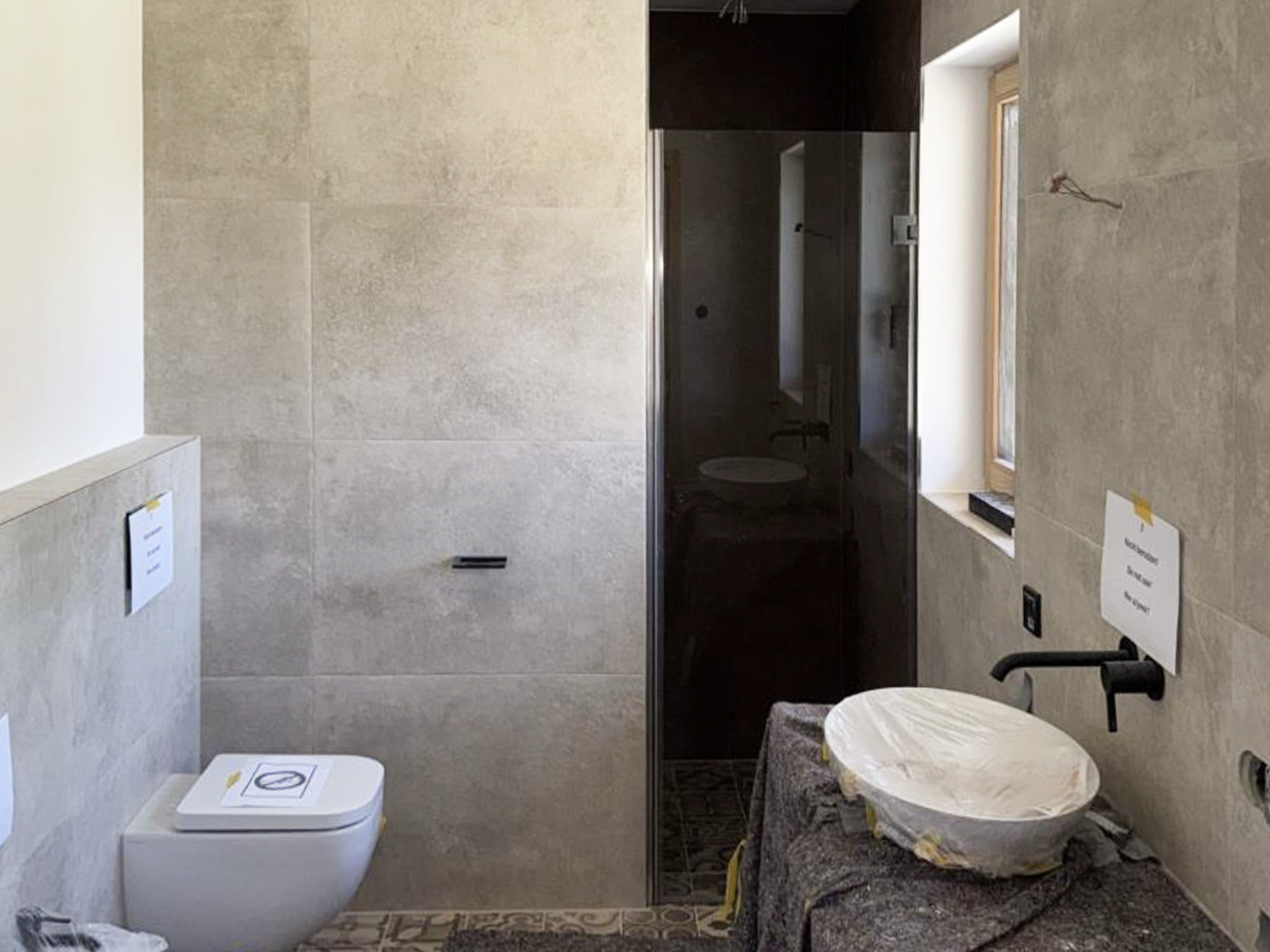 In den Landhausvillenhälften sind die Parkettarbeiten abgeschlossen und die Endmontagen in den Bädern haben begonnen.