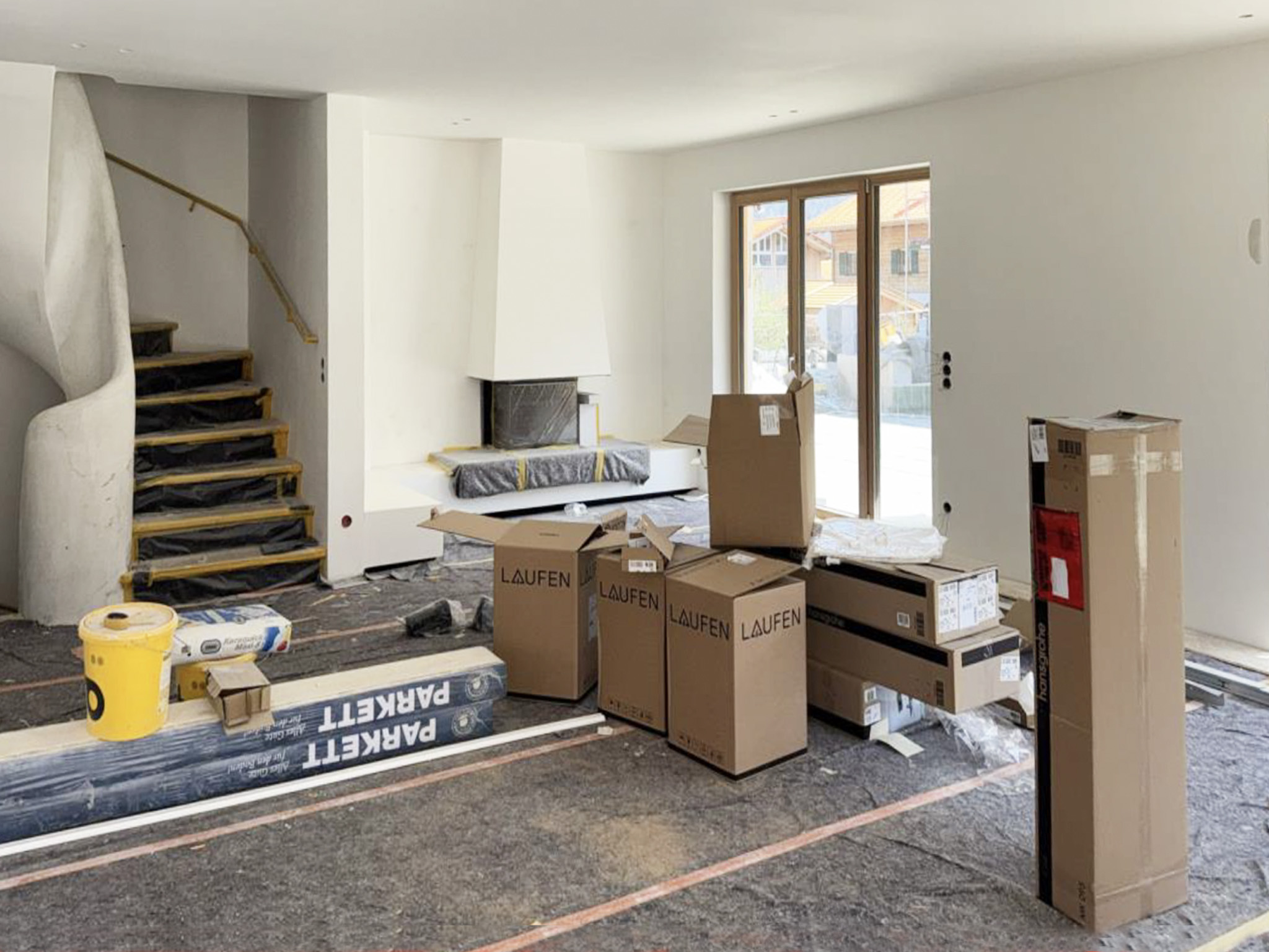 Die Estricharbeiten in Mehrfamilienhaus 8 sind abgeschlossen, während in Haus 9 noch die HLSE Rohinstallation in den Endzügen steckt.